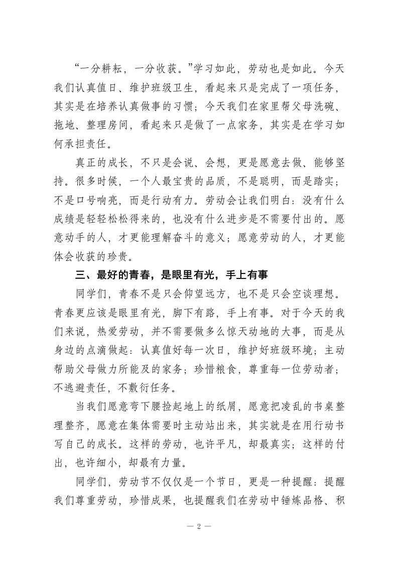 把热爱写进双手,把担当写进青春2026年劳动节中学生国旗下演讲稿尊敬的老师,亲爱的同学们:大家早上好!今天我国旗下演讲的题目是《把热爱写进双手,把担当写进青春》。每当提起“劳动”这个词,有的同学会想到工厂里的工人、田野里的农民、街头的环卫工人,觉得劳动离我们有些远。其实并不是这样。劳动并不只在远方,它就在我们的校园里、家庭中、生活细节里。教室的整洁,需要值日同学认真打扫;食堂的饭菜,离不开师傅们的辛勤忙碌;家里的温暖,也来自父母日复一日的付出。我们享受的每一份便利、每一份舒适,背后都有劳动的支撑。一、劳动不是“小事”,而是成长的必修课也许在一些同学眼里,扫地、擦黑板、整理课桌、帮父母做家务,只是一些不起眼的小事。但正是这些小事,最能看出一个人的责任心和行动力。一个愿意把值日做认真的人,往往更有责任感;一个愿意主动整理好自己物品的人,往往更懂得自律;一个愿意在家中分担家务的人,也更懂得体谅与感恩。劳动从来不只是“做一点事情”,更是一种品格训练。它让我们学会脚踏实地,学会不怕麻烦,学会把该做的事做好。中学生的成长,不只是知识的积累,也应该是责任意识的增强、生活能力的提升。可以说,劳动正是青春成长中不可缺少的一课。二、劳动不仅创造生活,也塑造自己1