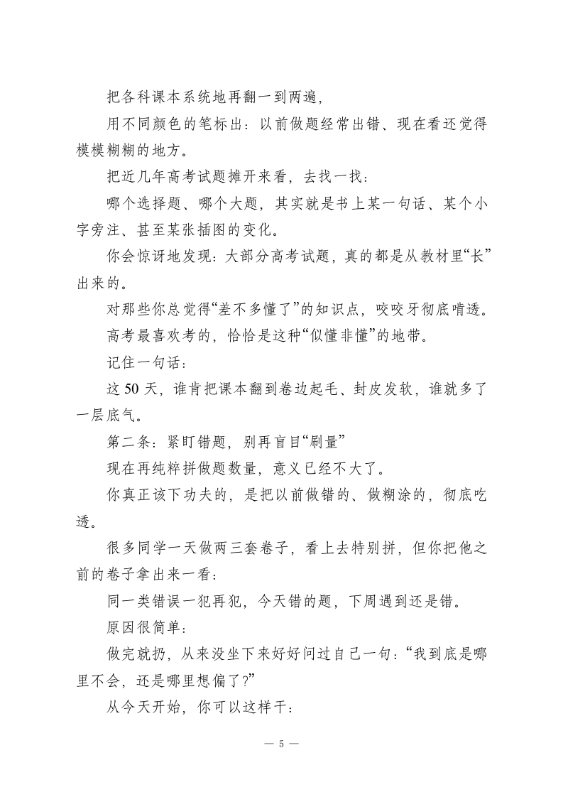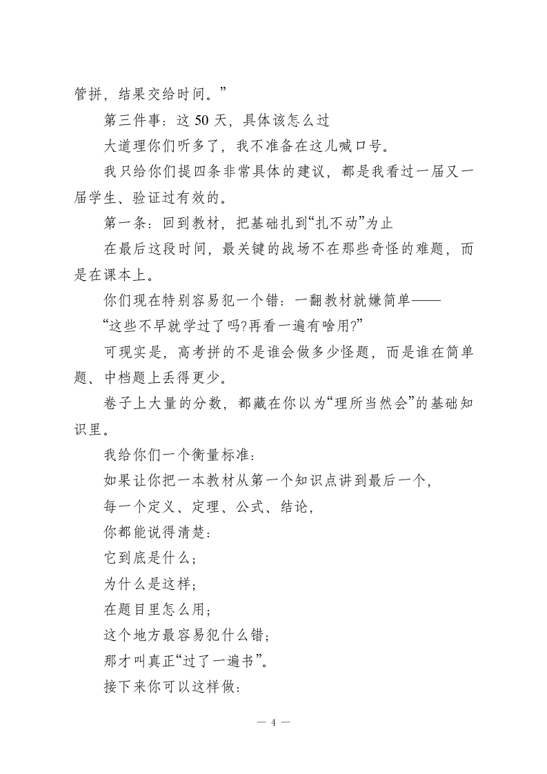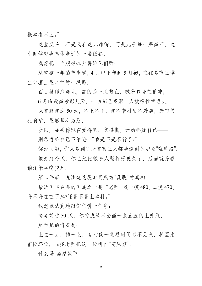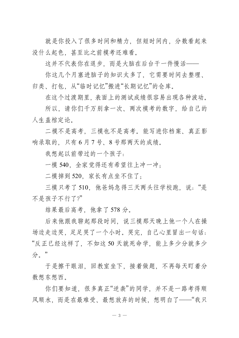 不喊口号谈真话!高考前50天校长这番话,句句说到学生心坎里各位高三的同学:今天是4月17日,再过整整50天,你们就要走进高考考场了。本来我也像往年一样,提前写好了一份长长的讲话,密密麻麻写了好几页。刚才上楼前,我把那叠纸又放回了办公室。这个时间,我觉得你们最不需要的是一场轰轰烈烈的动员会,最需要的是几句不拐弯的不客套话。所以,今天我就不念稿,就当是和你们坐在教室里,好好聊一聊这最后的50天。第一件事:先聊聊,我知道你们现在正难在哪里我带过很多届高三,对现在这个时间点,你们大概什么状态,其实心里有数。二模刚考完,有些同学走出考场,一看成绩比一模还低,当时心一下子凉透了;有些同学明明这两个月死磕某个专题,结果这次卷子上几乎没见着,觉得自己白忙活;有些人晚上躺在床上脑子停不下来,翻来覆去睡不着,白天坐在教室里人是坐着的,心神早飞了;也有人看着同桌、隔壁同学的卷子分数,突然冒出一个念头:“我是不是怎么追也追不上了?”还有一部分同学,已经开始被一个念头缠着:“会不会…我一1-