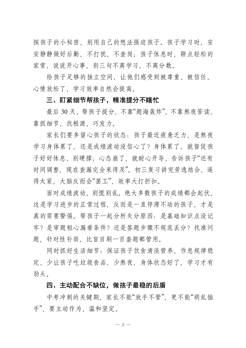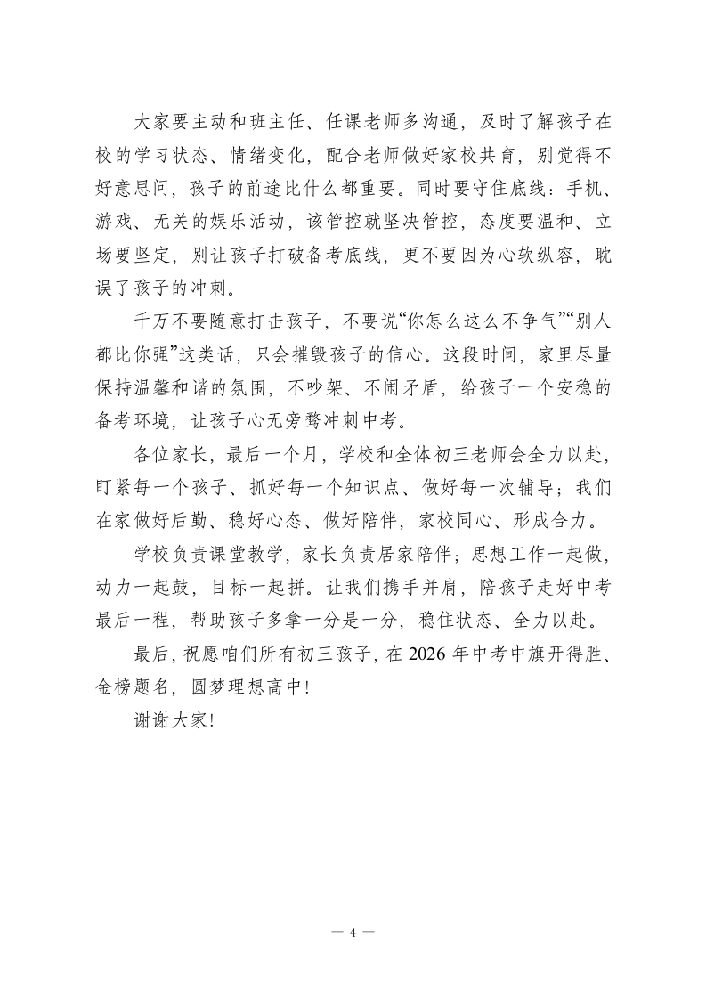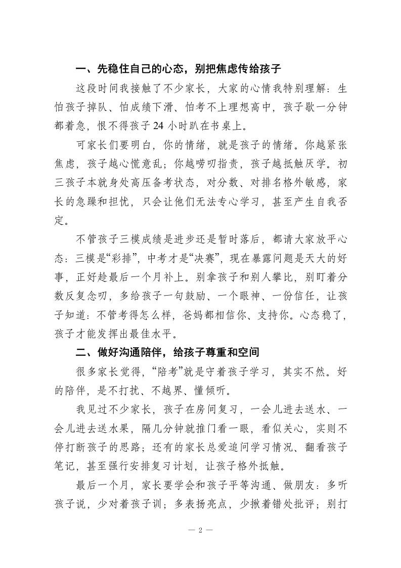 初三中考三模家长会校长讲话:携手助考精准提分,陪孩子打赢中考最后一仗尊敬的各位家长朋友、老师们、亲爱的同学们:大家上午好!刚才副校长已经把咱们初三2026年中考三模的整体成绩、学情分析、后续备考重点,跟大家做了全面又细致的汇报,我完全赞同。首先,我要为在座所有初三同学点个大大的赞!三模是中考前最贴近实战的全真模拟,孩子们能顶住压力、认真应考,每一分进步都藏着日夜的付出,每一次查漏都为中考铺路,这份努力特别可贵。同时,我要向坚守在一线的初三老师们道一声辛苦!从清晨早读到晚自习陪伴,从试卷分析到个性化辅导,大家把所有精力都放在了孩子身上;更要感谢各位家长,这段时间全力配合学校、用心陪伴孩子,家校同心,才是孩子备考最坚实的底气。各位家长,2026年中考距今只剩下最后一个月了。这30天,不是拼时间、拼题量的蛮干期,而是拼心态、拼细节、拼方法的提分黄金期。三模成绩有起伏、有波动,再正常不过一这场考试的意义,从来不是给孩子定结论,而是帮我们找准漏洞、补齐短板。今天我不讲空泛的大道理,就和大家聊几句实在话:最后冲刺阶段,咱们家长别慌、别乱、别添压,掌握实用助考攻略,真正帮孩子稳住心态、精准提分,以最好的状态迎战中考。一1