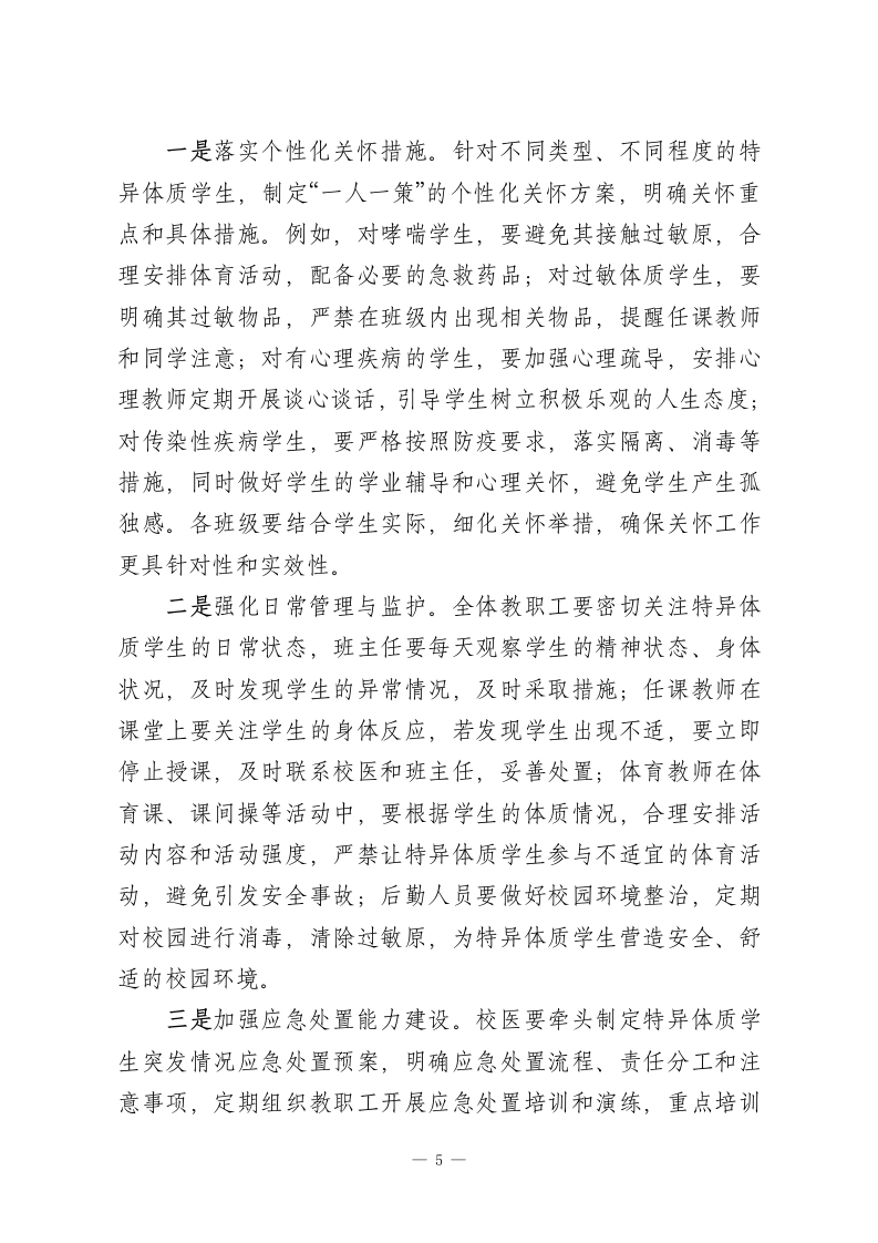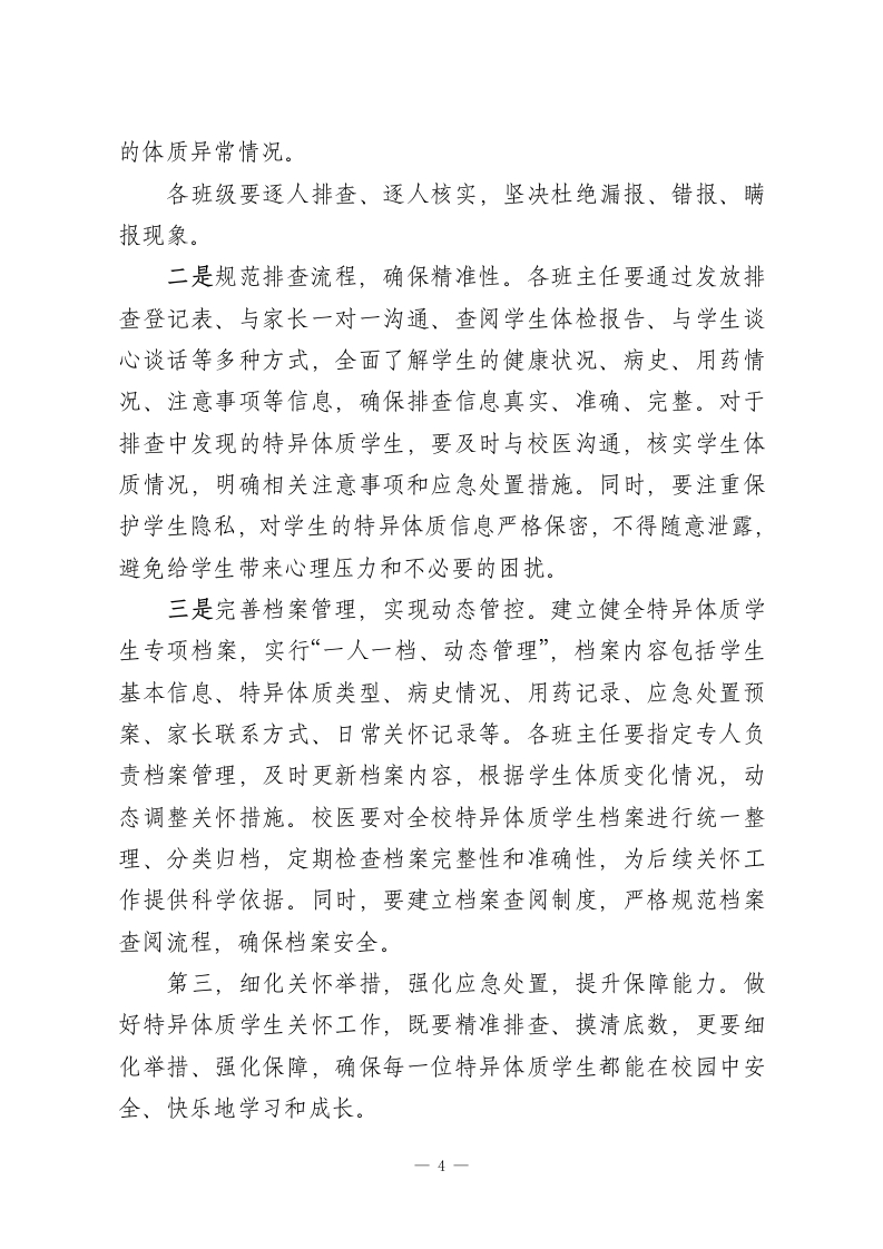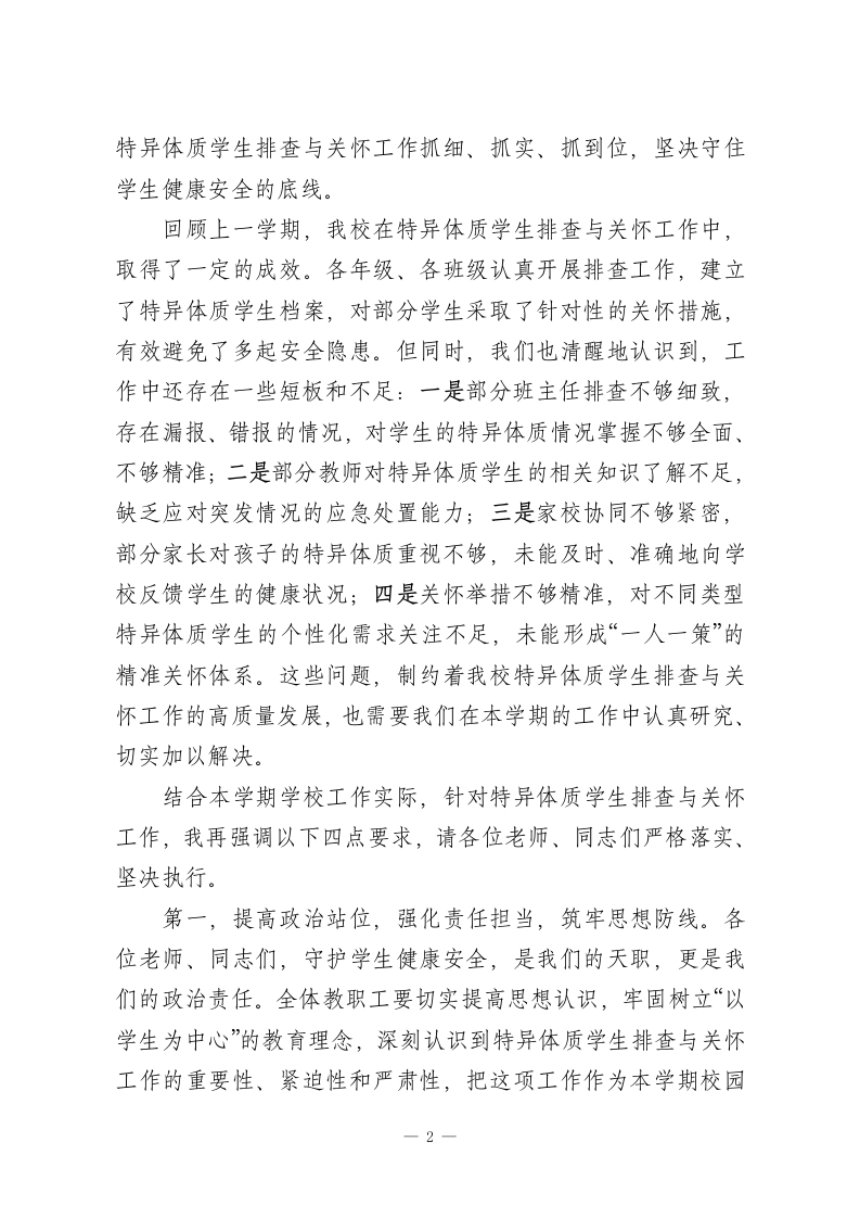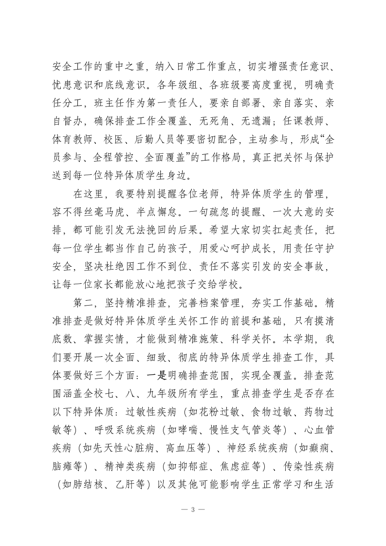 初中副校长在2026年春季学期特异体质学生排查与关怀工作讲话各位老师、同志们:大家上午好!春回大地,万象更新,我们满怀希望开启了2026年春季学期的崭新征程。教育的本质是立德树人,而守护每一位学生的健康成长,是立德树人的前提与基础,更是我们每一位教育工作者不可推卸的责任与使命。今天,我们专门召开本次会议,核心任务就是全面部署本学期特异体质学生排查与关怀各项工作,进一步统一思想、凝聚共识、细化举措,切实筑牢校园安全防线,用爱心、耐心和责任心,为每一位特异体质学生撑起一片温暖的成长天空。首先,我要强调的是,特异体质学生排查与关怀工作,不是一项简单的常规工作,而是一项关乎学生生命安全、关乎家庭幸福安宁、关乎学校教育形象的民生工程、底线工程。作为初中阶段的学生,正处于身心快速发展的关键时期,部分学生因先天遗传、后天患病等原因,存在过敏、哮喘、心脏病、癫痫、精神类疾病等特异体质,他们的健康安全需要我们给予更多的关注、更细致的呵护。近年来,全国各地校园中因特异体质学生管理不当引发的安全事故时有发生,这些悲剧不仅给学生家庭带来了无法弥补的伤痛,也给我们教育工作者敲响了沉重的警钟。前车之鉴,后事之师,我们必须深刻认识到这项工作的极端重要性和紧迫性,坚决摒弃麻痹思想、侥幸心理,把1