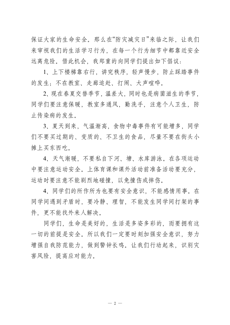 防震减灾教育,校长在国旗下讲话防灾减灾居安思危各位老师,同学们:大家早上好!今天我国旗下讲话的题目是:防灾减灾居安思危,2008年5月12日,我国四川省汶川县发生了8.0级特大地震,为了纪念这个日子,国务院决定每年的5月12日确定为“防灾减灾日”,今年2024年是第16个“防灾减灾日”宣传活动主题是:人人讲安全、个个会应急一着力提升基层防灾避险能力。我们的身边不可避免的存在着各种各样的灾害的侵犯的隐患,如台风、暴雨、火灾、地震、雷电、交通事故等等,因此,对我们全体师生而言,提高“防灾减灾”意识显得至关重要。灾害确实可怕,但比灾害更可怕的是无知,我们相信只要认真学习“防灾减灾”的基本常识,提高逃生的自救互救常识,我们完全可以把灾害的损害降低到最低,甚至完全可以避免灾害的发生。第一,要从课堂内外多种渠道了解灾害的起源以及怎样自救。比如,地震了怎么办?首先千万要冷静,要在老师的指挥下迅速抱头、闭眼,躲在各自的课桌下,绝不能乱跑或跳楼,待地震过后再有序地撤离。第二,除了了解这些知识之外,我们要认真参加学校安排的应急演练活动。学校每学期都会安排一次应急演练,希望同学加以重视,而不单单是觉得好玩,应付了事。同学们,防灾减灾,主要是要增强我们的风险防范意识,1
