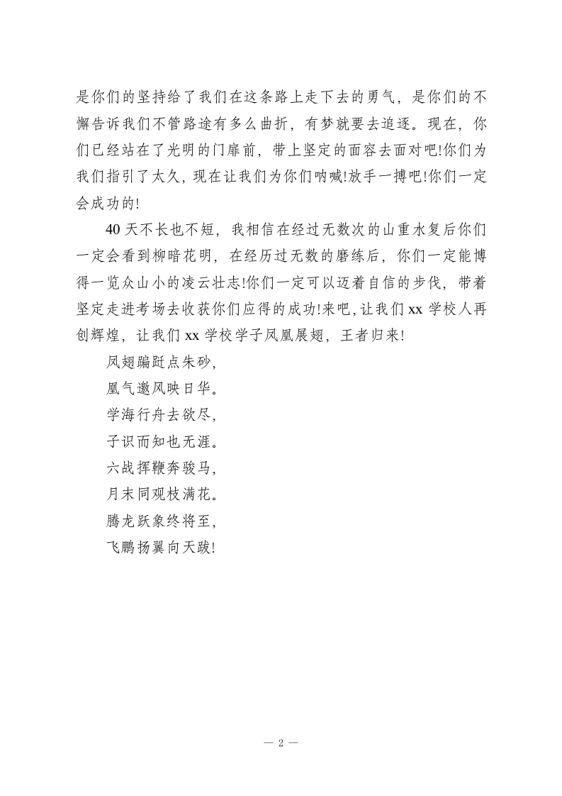 高考前40天,校长在国旗下讲话:凤凰展翅,王者归来亲爱的老师,同学们:早上好」今天我在国旗下讲话的的题目是:凤凰展翅,王者归来。40天,还有40天你们就将要步入高考的考场,收获胜利的果实!在此我谨代表全校所有的师生向你们表示祝福!希望你们能在高考中取得骄人的成绩!40天后,我们期待看到你们自信的步伐!因为作为xx学校人,你们有理由自信,有资格自信!三年来,你们在燥热的教室里埋头苦读,挥洒汗水,在沉静的深夜中挑灯夜读,惜时如金,在无数的考试中奋力拼搏,但求成功。是你们,在挫折中寻找经验,在绝望中求得希望你们有理由自信,因为你们十年来寒窗苦读,你们在这成千上万个日日夜夜中拼搏奋进,你们在青春这个美好的光阴中挥洒汗水,磨练意志,这么多年以来,你们有了破釜沉舟的勇气与背水一战的魄力,更应有的是对自己的那份信心!相信自己!日日夜夜的奋斗终有回报,点点滴滴的汗水必有收获。现如今,是时候在高考的战场上收获胜利了!40天后我们期待看到你们坚定的面容!高三,没有悠然,没有洒脱,没有安闲,有的只是紧张与坚定。走向光明的路是最为黑暗的,你们是我们在这条路上的灯塔。堆起的书籍遮住了你们疲倦的面容,但是舞动的笔却告诉我们你们还在坚持,尽管夜晚已经降临,但是点亮的白炽灯却告诉我们你们还在坚持。1