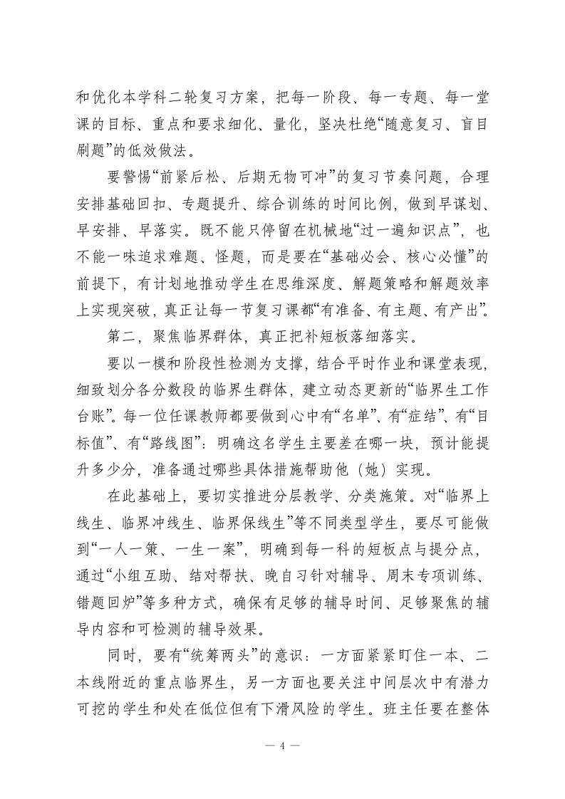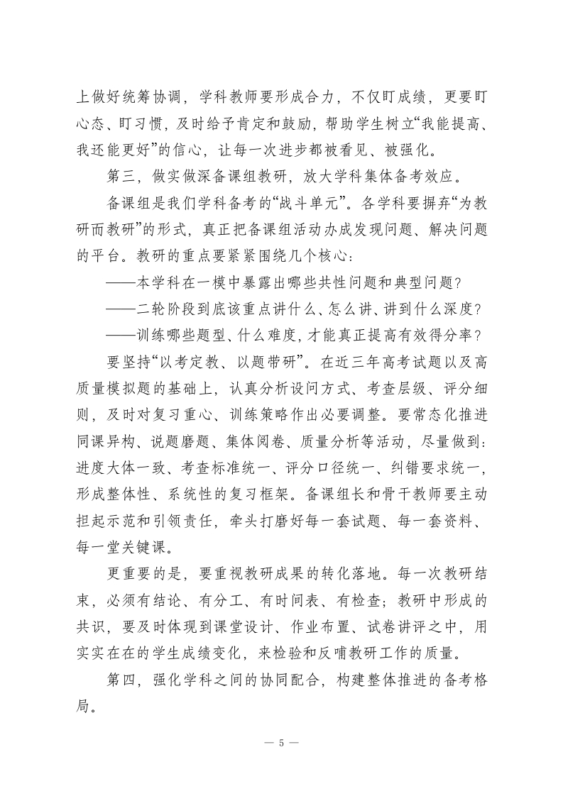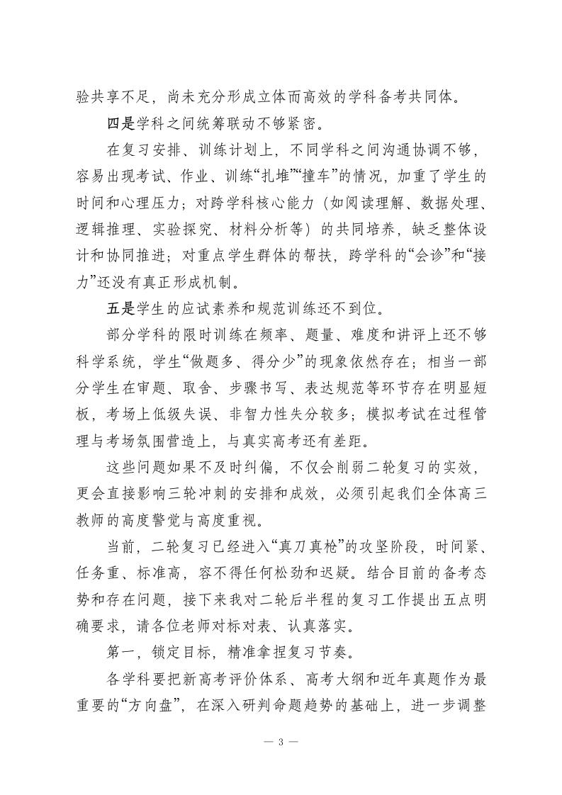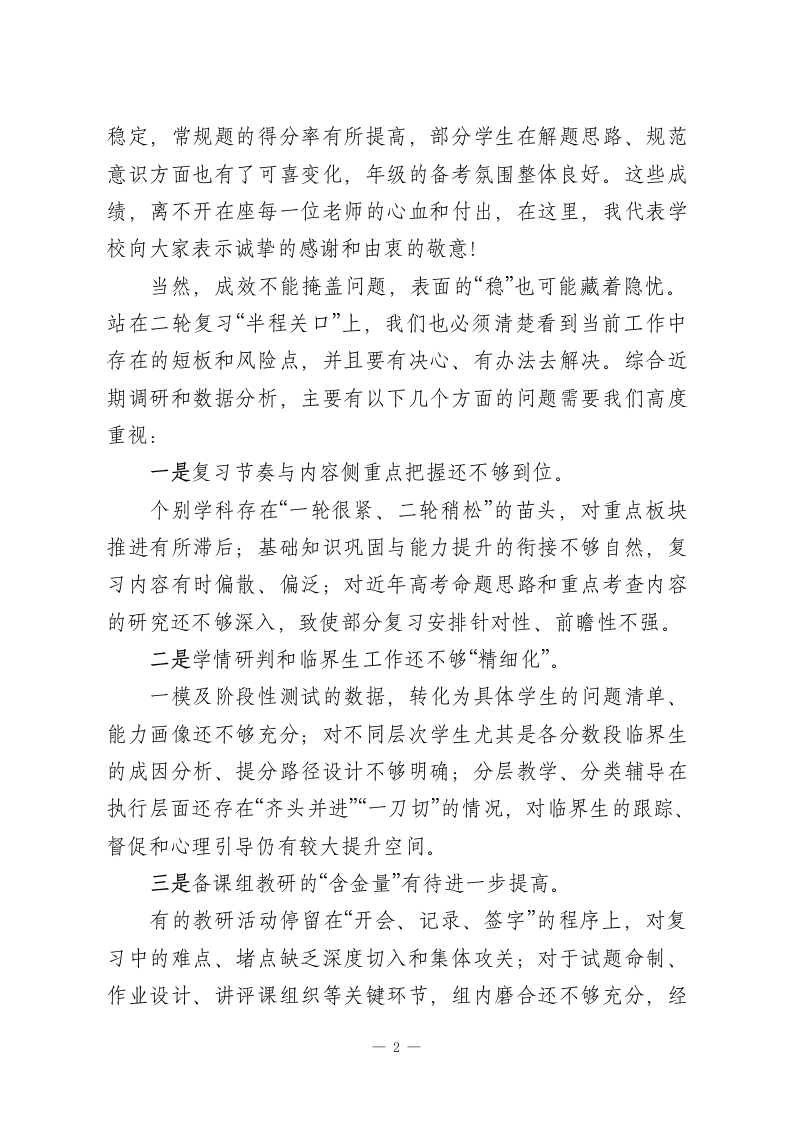 高三二轮中期总结及学科调度会:3个聚焦、5点发力!各位高三的老师们:大家下午好!今天把大家集中到一起,召开高三二轮复习阶段总结暨学科备考调度会,目的非常明确:系统梳理前一阶段复习情况,找准影响备考质量的关键问题,进一步统一认识、找准方向、协同发力,用好二轮复习这个“决定性窗口期”,为后续三轮冲刺和高考正面交锋打下更加坚实、更加可靠的基础。二轮复习在整个高三备考链条中处在承前启后的“中枢位置”。一轮更多侧重打基础、补漏洞,三轮则着眼临考前的综合提升和状态调整,而二轮既要在一轮基础上再夯实、再提纯,更要通过专题突破、能力训练、规范强化,把学生真正从“会一点”推向“会系统、会应用、会拿分”,并与三轮冲刺顺畅衔接。因此,二轮复习的质量,直接决定后期还有多少提升空间,关系到今年高考的整体高度,也关系到每一位学生能站上怎样的起点。二轮复习启动以来,高三全体老师团结一心、实干为先,很多老师从清晨到夜晚坚守在一线;各备课组提前谋划、精细安排,在课堂设计、限时训练、学情分析、临界生帮扶等方面下了很大功夫,也取得了看得见的阶段性成果。从近期一模考试和多次限时训练反馈的数据来看,多数学科的复习进度总体上符合原定安排,学生的基础知识掌握更加一1