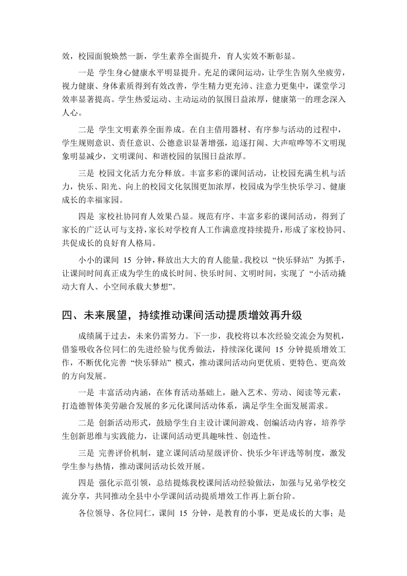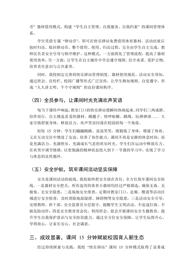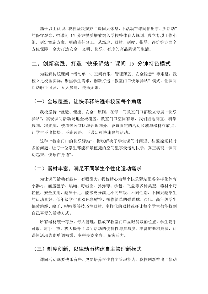 课间15钟活动提质增效经验交流,校长汇报发言:打造快乐驿站,激活课间活力尊敬的各位领导、各位教育同仁:大家上午好!非常荣幸能够参加本次全县中小学课间活动提质增效经验交流会,与各位教育同行共同探讨如何优化校园课间活动、提升育人实效。课间15分钟,是校园生活中最灵动、最鲜活的片段,是学生放松身心、调节状态、发展兴趣、增进友谊的黄金时间,更是落实“五育并举”、促进学生身心健康发展的重要载体。近年来,我校始终坚持以生为本,聚焦课间15分钟提质增效,以“小课间、大文明、小活动、大健康”为理念,创新打造“快乐驿站”特色课间模式,让有限的课间时间释放无限的成长能量,让每一位学生在课间动起来、乐起来、成长起来。下面,我就我校课间15分钟提质增效的实践探索与成效,向各位领导、同仁作简要汇报。一、提高站位,深刻认识课间15分钟的育人价值校园课间,看似短暂,却承载着重要的教育使命。在“双减”政策深入推进、学生全面发展备受重视的今天,课间15分钟早已不是简单的休息时间,而是校园教育生态的重要组成部分,是连接课堂教学与课外生活的关键纽带。首先,课间15分钟是学生身心健康的“调节器”。长时间端坐课堂,学生容易产生疲劳、注意力下降等问题,科学合理的课间活动,能够让学生舒展筋骨、放松眼睛、调节情绪,有效缓解学习压力,为下一节课储备充沛精力,实现“劳逸结合、高效学习”。其次,课间15分钟是学生习惯养成的“练兵场”。自主参与活动、有序使用器材、友好同伴交往、爱护公共财物、遵守活动规则,这些看似微小的行为,都是学生规则意识、文明素养、责任意识养成的重要途径,是立德树人在校园生活中的具体体现。再次,课间15分钟是学生全面发展的“加油站”。丰富多彩的课间活动,能够满足学生运动、交往、探索、创造的需求,培养学生的运动兴趣、协作能力、创新思维,让学生在轻松愉悦的氛围中实现德智体美劳全面发展,为终身发展奠定坚实基础。