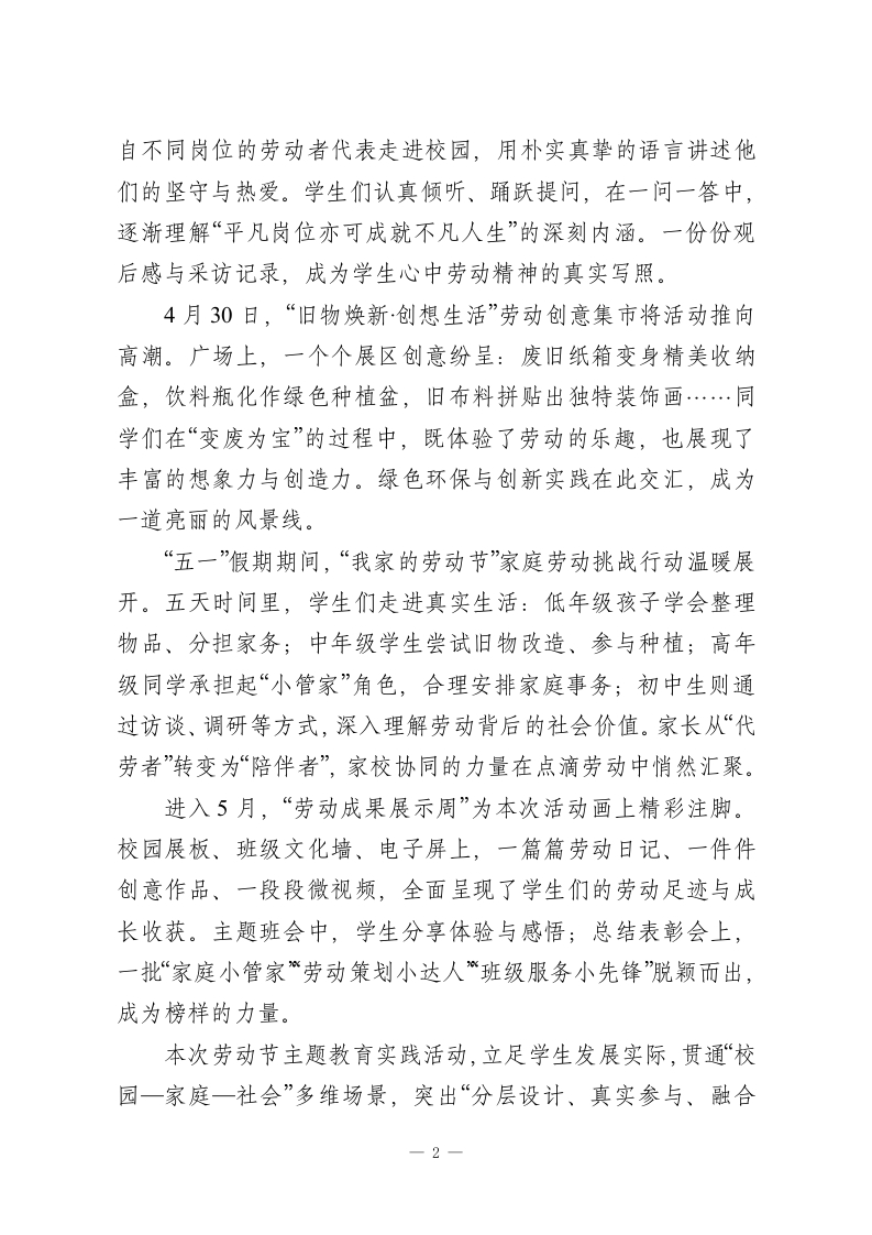 劳动点亮成长创新成就未来学校2026年“五一”劳动节活动通讯稿在春意渐浓、万物竞发的四月末,伴随着第136个“五一”国际劳动节的到来,我校以“劳动点亮成长,创新成就未来”为主题,精心组织开展了一系列富有温度与深度的劳动教育实践活动。活动历时近三周,通过校园、家庭与社会多场景联动,让劳动不再只是节日里的“仪式”,而真正成为滋养学生成长的生动课堂。4月27日上午,主题启动仪式在庄严的升旗仪式中拉开帷幕。国旗下,《劳动让成长更有力量》的深情讲话,唤起了全体师生对劳动价值的深刻认同。学生代表发出“从小事做起、用双手创造美好”的倡议,教师代表系统解读活动安排,现场还表彰了“校园劳动之星”和“文明值日示范班”。一时间,“劳动最光荣”的理念在校园内悄然生根。紧随其后的“校园劳动实践周”,让整个校园成为一方流动的“劳动课堂”。教室里,同学们认真整理书桌、优化图书角;操场上,责任区清扫有序推进;劳动基地中,松土、除草、浇水一气呵成。每一处角落,都留下了学生们专注而投入的身影。劳动不仅美化了环境,更在潜移默化中培养了学生的责任意识与协作能力。4月29日下午,“劳模工匠进校园”成长讲堂如约举行。来1