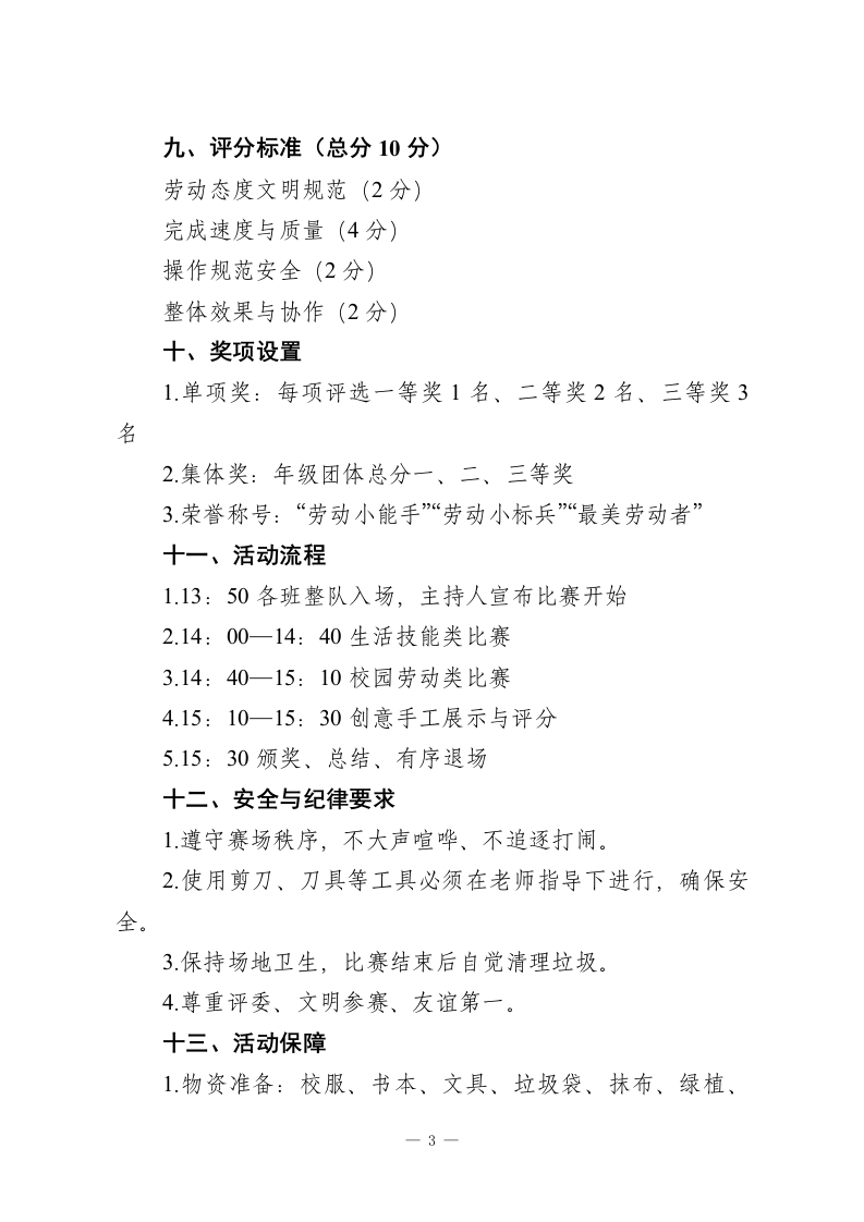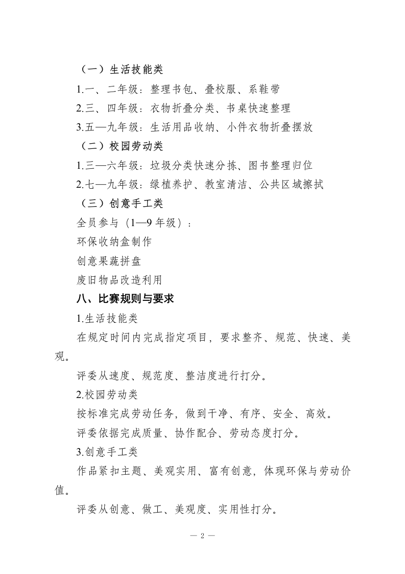 劳动砺心志,实践促成长2026年五一劳动节“劳动技能大比拼”活动实施方案一、活动主题劳动砺心志,实践促成长二、活动目的以劳动技能竞赛为载体,检验学生劳动素养,提升生活自理、校园服务、动手创造等综合能力,激发学生热爱劳动、勤于实践的热情,营造“比、学、赶、帮、超”的劳动氛围,培育新时代劳动小能手。三、组织单位主办:学校德育处、少先队大队部承办:各年级组、各班班主任评委:校领导、德育处成员、各年级教师代表四、活动时间2026年4月29日(周三)下午2:00—3:30五、活动地点学校操场、教学楼大厅、劳动实践基地六、参赛对象全校1一9年级学生,以班级为单位组队参赛七、比赛项目与分组本次比赛分三大类、分学段开展,全员参与、择优竞技。一1