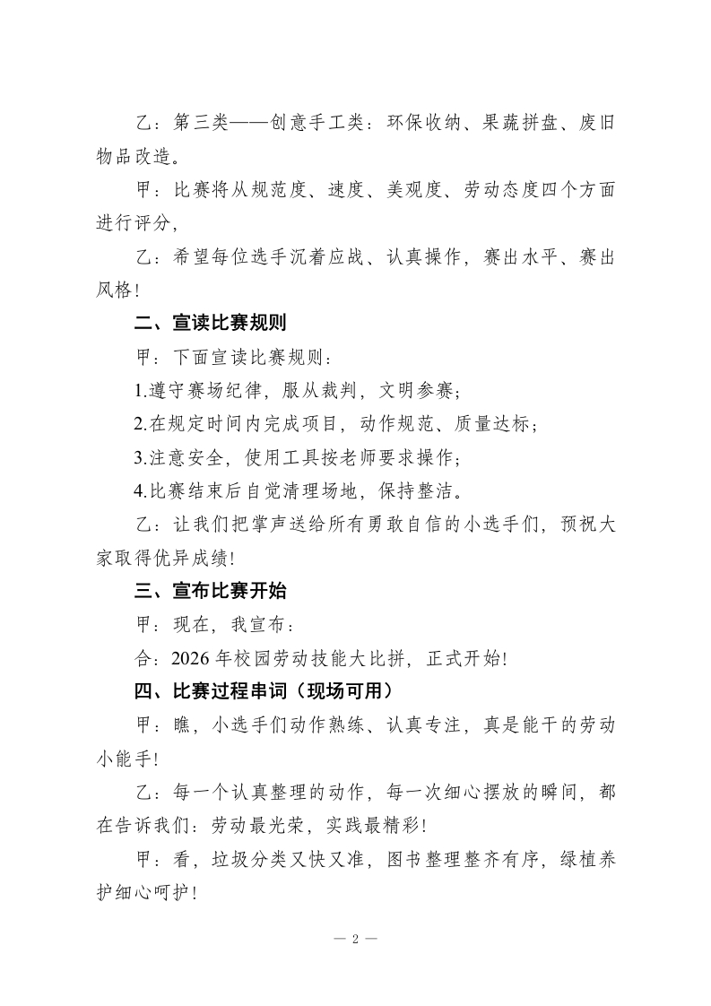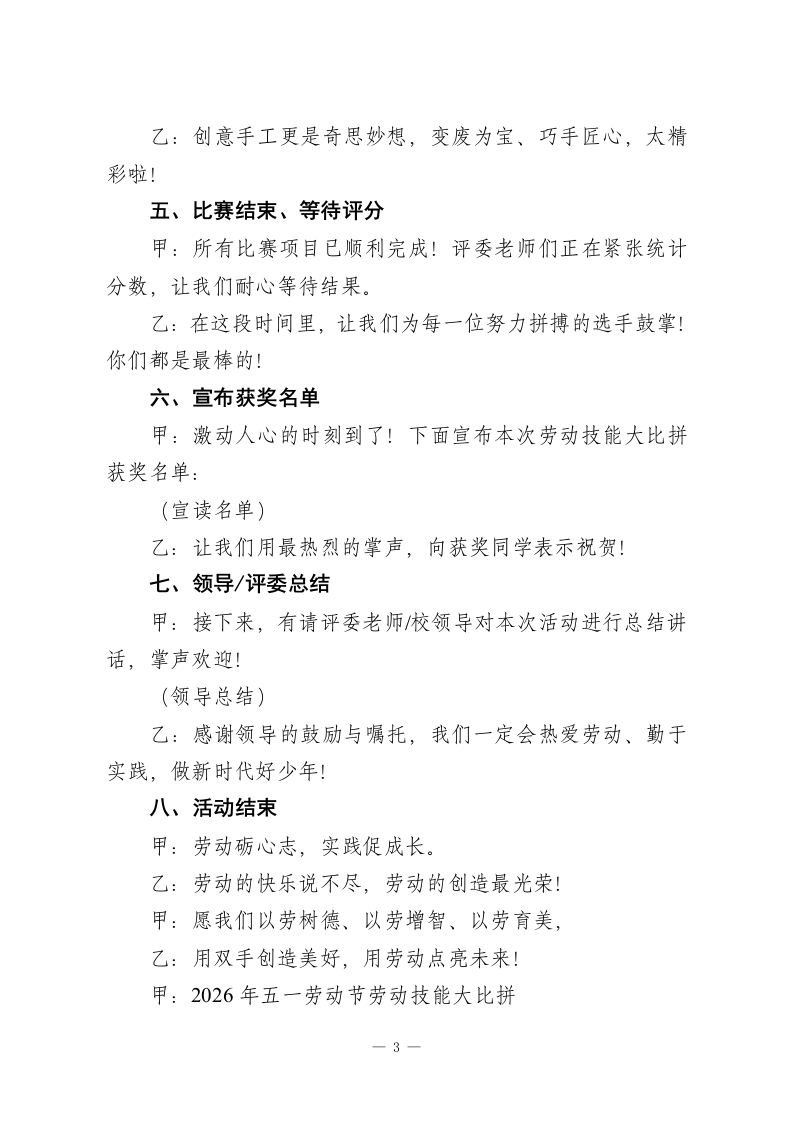 劳动砺心志,实践促成长2026年五一劳动节劳动技能大比拼活动主持稿主持人:甲、乙(学生主持人)》甲:尊敬的各位领导、老师们,乙:亲爱的同学们,合:大家下午好!甲:劳动是财富的源泉,也是幸福的源泉。乙:实践是成长的课堂,也是梦想的翅膀。甲:为迎接“五一”国际劳动节,落实劳动教育要求,展现同学们的劳动风采,今天我们隆重举行“劳动砺心志,实践促成长”校园劳动技能大比拼!乙:在这里,我们将比拼整理收纳、清洁服务、创意手工,用双手展示技能,用行动诠释热爱!甲:出席本次活动的有校领导、评委老师以及各班参赛选手,让我们以热烈的掌声欢迎大家的到来!一、介绍比赛项目甲:本次技能大比拼共分三大类:乙:第一类一生活技能类:整理书包、叠校服、系鞋带、书桌收纳:甲:第二类一一校园劳动类:垃圾分类、图书整理、绿植养护、清洁擦拭:一1