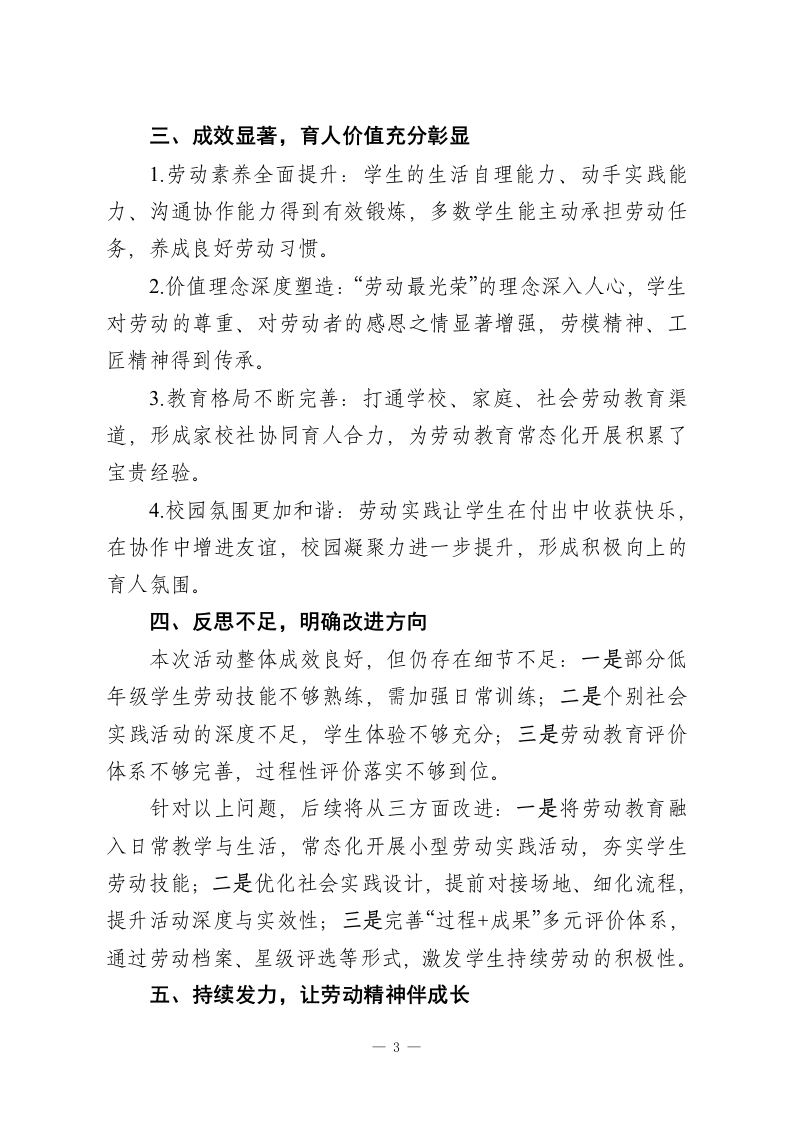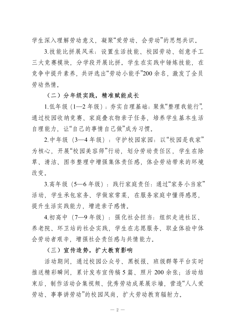 劳动砺心志,实践促成长2026年五一劳动节主题教育活动总结为深入落实《义务教育劳动课程标准》要求,厚植学生劳动价值观,完善“学校一家庭一社会”三位一体劳动教育格局,我校于2026年4月27日一5月8日成功开展“劳动润心启新程,实践笃行向未来”五一劳动节主题教育系列活动。活动覆盖全校1一9年级全体师生,通过多样化、分层化的劳动实践,实现了“以劳树德、以劳增智、以劳强体、以劳育美”的育人目标,现将活动总结如下:一、精心筹备,周密部署,筑牢活动根基活动开展前,学校德育处牵头制定详细实施方案,明确活动主题、目标、内容及保障措施,细化各部门、各年级职责分工。通过专题会议部署、班主任培训、校园宣传等形式,凝聚全校共识;提前联系行业劳模、协调社会实践场地,准备劳动工具、竞赛物料及荣誉证书;同时通过致家长一封信、班级群沟通等方式,争取家长支持,为活动顺利开展奠定坚实基础。二、多维开展,亮点纷呈,劳动教育落地见效(一)核心活动引领,厚植劳动精神1.升旗仪式传薪火:特邀行业劳模分享奋斗故事,用真实经历诠释劳动价值;学生代表发声、集体宣誓、齐唱劳动歌曲,多形式营造崇尚劳动的浓厚氛围,让劳动精神根植学生心中。2.主题班会凝共识:各班以“劳动点亮美好生活”为主题,通过观看纪录片、情景演绎、讨论分享、制定公约等形式,引导1