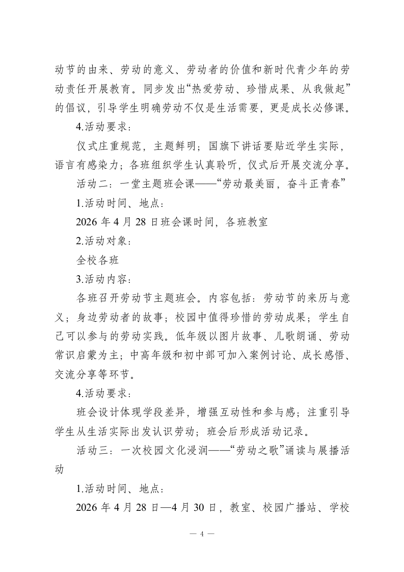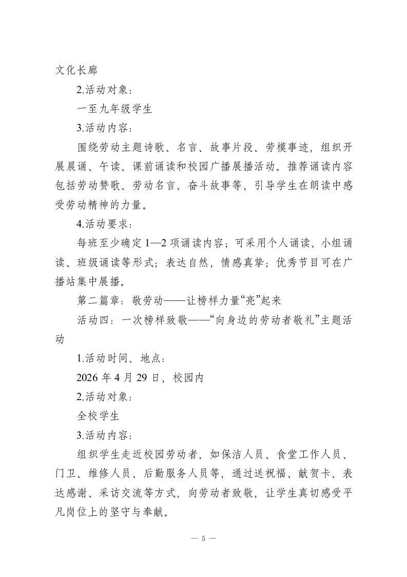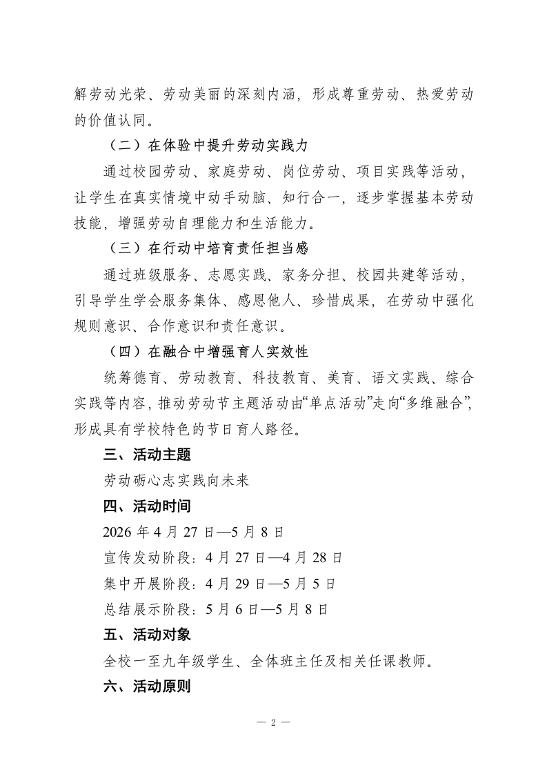 劳动砺心志实践向未来一一2026年学校劳动节活动实施方案第一篇章:知劳动一让劳动精神“立”起来第二篇章:敬劳动一让榜样力量“亮”起来第三篇章:行劳动一让实践体验“实”起来第四篇章:创劳动一让时代气息“新”起来为深入落实立德树人根本任务,全面加强新时代劳动教育,充分发挥劳动节育人功能,引导学生在认识劳动、尊重劳动、参与劳动、创新劳动中树立正确劳动观,增强责任意识、实践能力和奋斗精神,结合我校办学实际,决定在全校开展2026年劳动节主题教育活动,现制定如下实施方案。一、活动背景“五一”国际劳动节是弘扬劳动精神、劳模精神、工匠精神的重要契机,也是学校推进劳动教育、深化“五育并举”的重要载体。劳动不仅是创造美好生活的重要方式,也是促进学生全面发展的重要路径。学校立足不同学段学生成长特点,围绕“认知启蒙、情感浸润、实践锻炼、创新表达”四个维度,组织开展劳动节主题活动,让学生在“知劳动、敬劳动、行劳动、创劳动”中感受劳动价值、涵养劳动情怀、提升劳动素养,推动劳动教育由节日活动走向日常养成、由单一体验走向综合育人。二、活动目标(一)在认识中树立正确劳动观通过主题教育、榜样学习、故事分享等活动,引导学生理-1