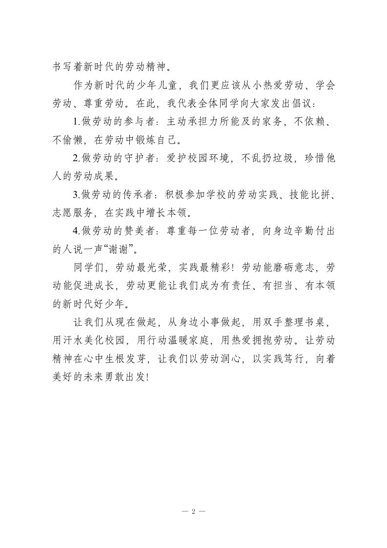 劳动润心启新程,实践笃行向未来2026年五一劳动节国旗下学生讲话稿尊敬的各位老师,亲爱的同学们:大家早上好!我是来自年级班的。今天,我国旗下讲话的题目是:劳动润心启新程,实践笃行向未来。春风送暖,万物生长,在这充满希望的四月,我们即将迎来全世界劳动者共同的节日一一“五一”国际劳动节。劳动,是中华民族的传统美德;劳动,是我们成长路上最坚实的力量。从古代的“民生在勤,勤则不匮”,到今天的“劳动创造幸福,实干成就伟业”,劳动始终是推动我们前行的不竭动力。同学们,劳动并不遥远,它就在我们身边:在家里,主动整理书包、叠好衣物、打扫房间,是劳动;在学校,认真打扫卫生、爱护花草树木、保持教室整洁,是劳动;在生活中,学会一项技能,做好一件小事,用双手为家人分担,也是劳动。劳动,让我们学会独立;劳动,让我们懂得感恩;劳动,更让我们明白:所有美好的生活,都要靠双手去创造。在我们身边,有无数默默奉献的劳动者:环卫工人起早贪黑,守护校园与城市的洁净;老师们辛勤耕耘,教会我们知识与道理;爸爸妈妈辛苦工作,为我们撑起温暖的家;还有大国工匠、航天英雄、医护人员、志愿者们…他们用坚守与付出,1