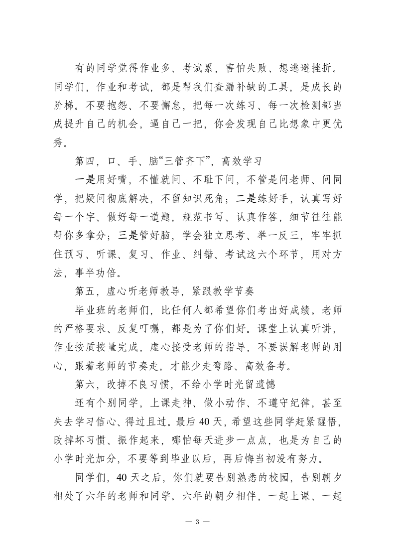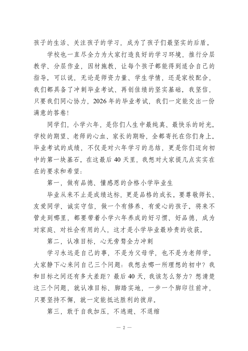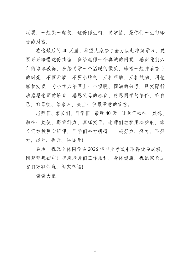 六年级毕业倒计时40天思想动员会校长讲话一一惜同窗师生情,拼最后四十天,为小学时光画圆满句号尊敬的老师们、亲爱的同学们、各位家长朋友们:大家下午好!春风送暖,岁月匆匆,转眼间,咱们2026年的六年级毕业季,已经走到了倒计时40天的关键节点。今天我们齐聚在这里,召开这场思想动员会,既是为即将到来的毕业考试加油鼓劲,更是想和大家说说掏心窝子的话一一在全力冲刺学业的同时,千万别忘了好好珍惜相伴六年的师生情、同学情,让小学最后一段时光,既有拼搏的汗水,更有温暖的回忆。首先,我要为咱们六年级的全体师生和家长,由衷地点个赞。这六年,从刚入学时懵懂可爱、蹦蹦跳跳的小不点,到如今懂事上进、朝气蓬勃的少年,孩子们的每一点成长、每一次进步,都离不开老师们的悉心教导,离不开家长们的默默陪伴。咱们六年级的老师们,个个业务精湛、用心尽责。每天早来晚走,认真备课、细致批改、耐心辅导,把所有的心血都倾注在孩子们身上,陪着大家刷题、纠错、查漏补缺,从来没有半句怨言;咱们的同学们,经过六年的学习和养成教育,早已养成了良好的习惯,遵规守纪、勤奋好学,进入六年级后,更是一下子长大了、成熟了,懂礼貌、知上进,基础打得扎扎实实;咱们的家长朋友们,全力配合学校、支持老师,用心照顾1