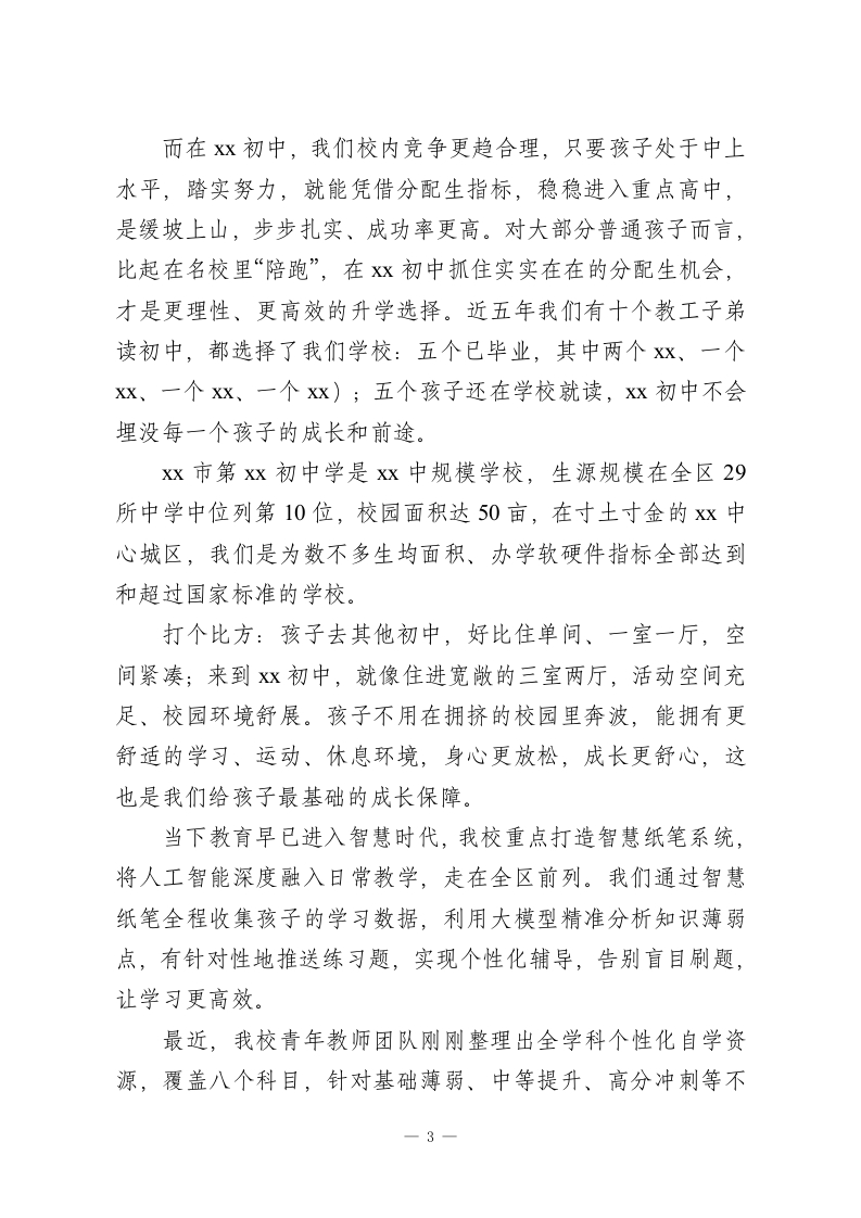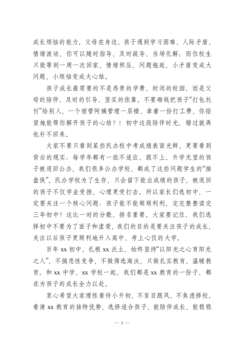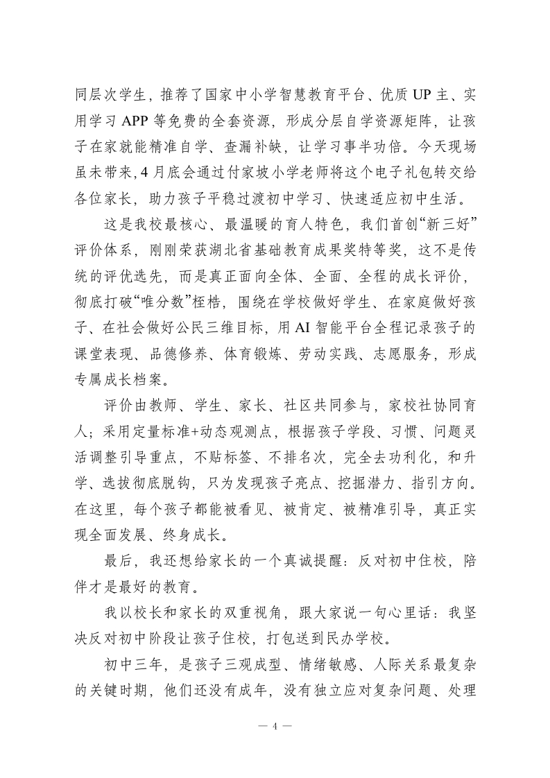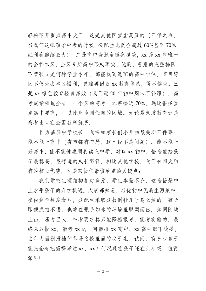 六年级小升初家长会上,校长讲话:为孩子的成长全力以赴尊敬的各位家长朋友:大家好!这里,我是Xx初中校长,更是xx教育的一名基层校长,今天来到我们Xx小学,和六年级家长聊聊孩子小升初的关键选择,倍感亲切。首先我要明确一点:我们x小学对口Xx初中、xx初中、xx初中,三所学校绝非竞争关系,而是Xx教育共同体里的伙伴。我们共同的目标,是让孩子们留在Xx、扎根对口学校,享受x优质教育红利,这是我们的初心,也是给孩子最稳妥的成长保障。今天我要给大家带来三样东西:一是镇定剂,不要被小升初的焦虑裹挟,不要被那些制造焦虑、贩卖焦虑的网红带偏了;二是定心丸,给对口Xx初中的家长讲一讲学校的优势和红利,你们不是“背时”的那一批,而是幸运的一批人:三是防疫针,给所有孩子和家长一点忠告,不要为了图面子、图省事,花钱把孩子“打包”交给别人,陪伴才是最好的爱、最好的教育。Xx教育的优势,是全市独一份的硬核底气。一是分配生红利独占鳌头,我区分配生指标数量、占比稳居全市第一,按现行50%分配生政策,每4个Xx孩子就有1人能享受分配生福利,一1