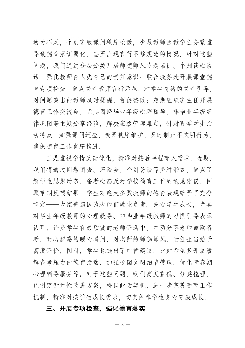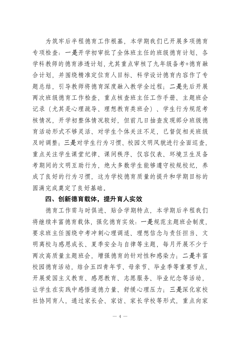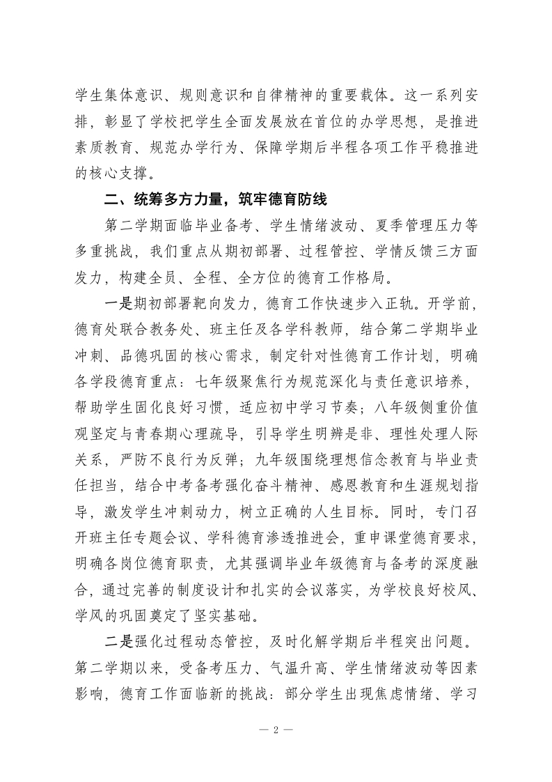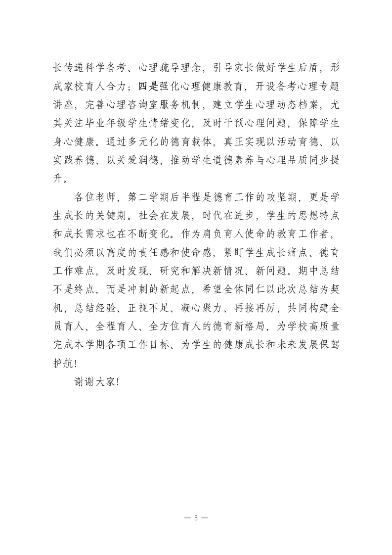 期中德育工作总结,副校长发言:立德树人守初心,德育工作再前行各位老师、同仁们:大家好!第二学期已过半程,校园各项工作逐步进入巩固提升、冲刺收官阶段。学校始终坚守立德树人根本任务,以求实务实、以生为本为工作理念,将德育工作深度融入教学冲刺、毕业备考和学生成长关键期,以行为规范强化、师德师风提质、德育载体创新为抓手,稳步推进各项德育工作,取得了阶段性成效。今天,我们在此总结第二学期期中德育工作,既是对过往的梳理沉淀,更是对后半程育人工作的精准发力。下面,我从四个方面向大家作具体汇报:一、锚定学期重点,夯实德育根基德育是学校教育的灵魂,第二学期作为学生成长的关键冲刺期,我们始终坚持五育并举、德育为先,将德育工作与学期核心任务紧密结合。在课程设置上,严格落实国家课程计划,开足开齐思想政治、音乐、体育、美术等具有德育渗透功能的课程,配备专业教师任教,尤其注重在思政课中强化理想信念教育、在艺术课程中厚植文化自信、在体育课程中锤炼拼搏精神,打破重智育轻德育的传统认知,确保学生综合素质全面提升。在作息与活动安排上,严格遵照省教育厅要求,落实7:00到校制度,每天保障学生1小时课外活动时间,其中15分钟课间操和5分钟眼保健操不仅是健康第一理念的践行,更是培养—1